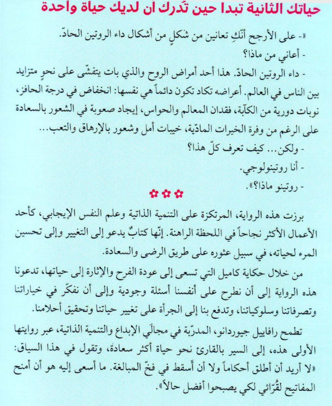 "- على الأرجح أنّكِ تعانين من شكلٍ من أشكال داء الروتين الحادّ. - أعاني من ماذا؟ - داء الروتين الحادّ. هذا أحد أمراض الروح والذي بات يتفشّى على نحوٍ متزايد بين الناس في العالم. : انخفاض في درجة الحافز ، نوبات دورية من الكآبة، فقدان المعالم والحواس، إيجاد صعوبة في الشعور بالسعادة على الرغم من وفرة الخيرات "