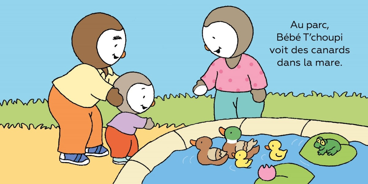 En sécurité dans les bras de papa, dans la poussette ou à quatre-pattes dans l'herbe, Bébé T'choupi adore se promener. Il croise un enfant sur son vélo, joue avec son ballon, rencontre un petit chien, observe des canards, prend son goûter.