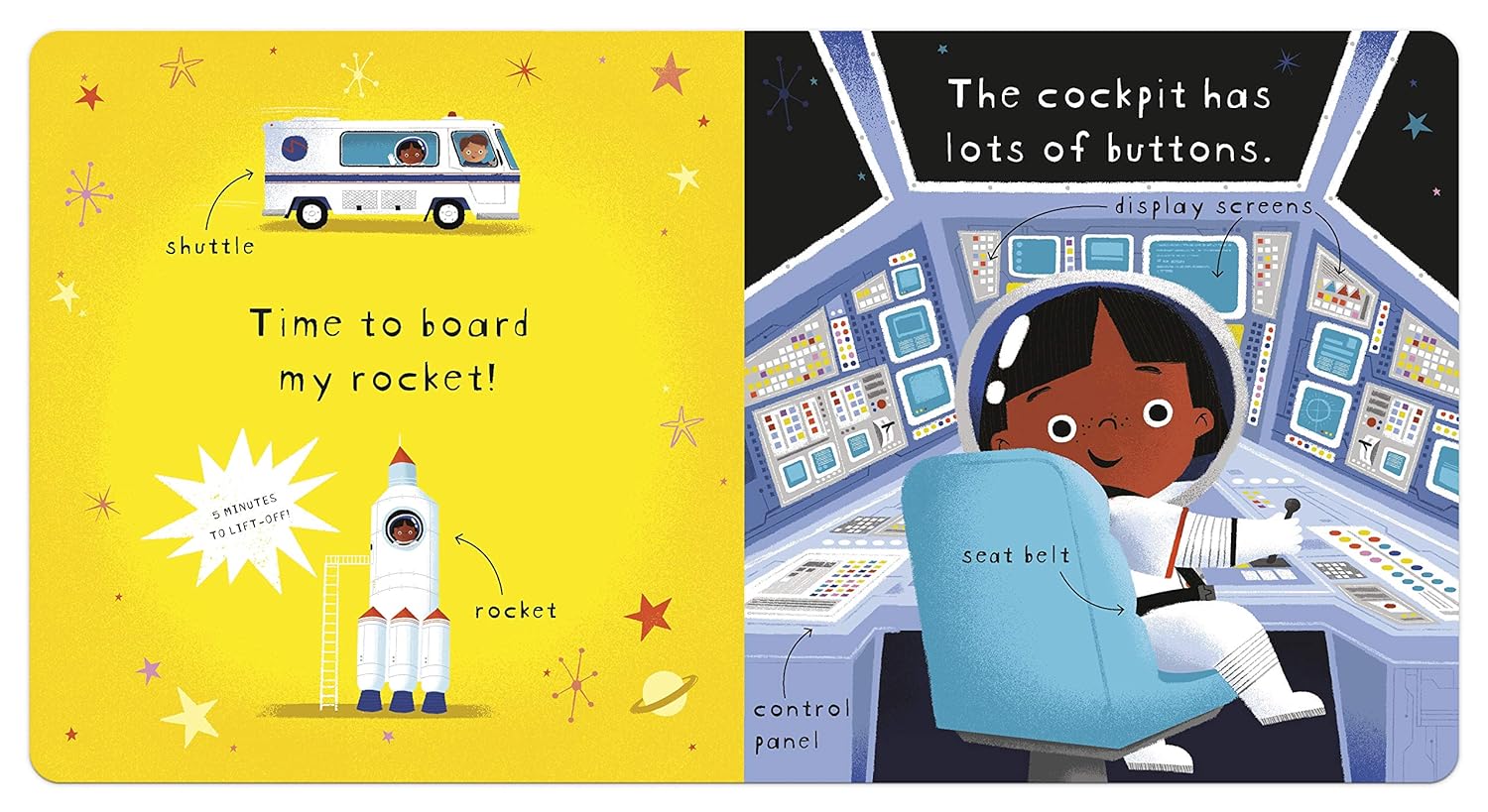 This book will help kids to imagine what it's like to be an astronaut! Starting with putting on the spacesuit and then entering the cockpit before blastoff, to visiting the space station and zooming around some planets, this book provides an early introduction to a day in the life of a busy astronaut. The surprise mirror at the end provides a fun, interactive bonus!
