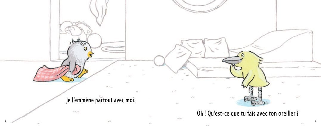 Hibou fait des câlins à son oreiller-doudou. Mmm ! Il sent bon comme les plumes de sa maman. Mmm ! Poussin et corbeau le rejoignent avec leurs doudous. Mmm ! Va vite chercher ton doudou, Piou-Piou ! "Mais, j'ai pas de doudou"... Pour les tout-petits