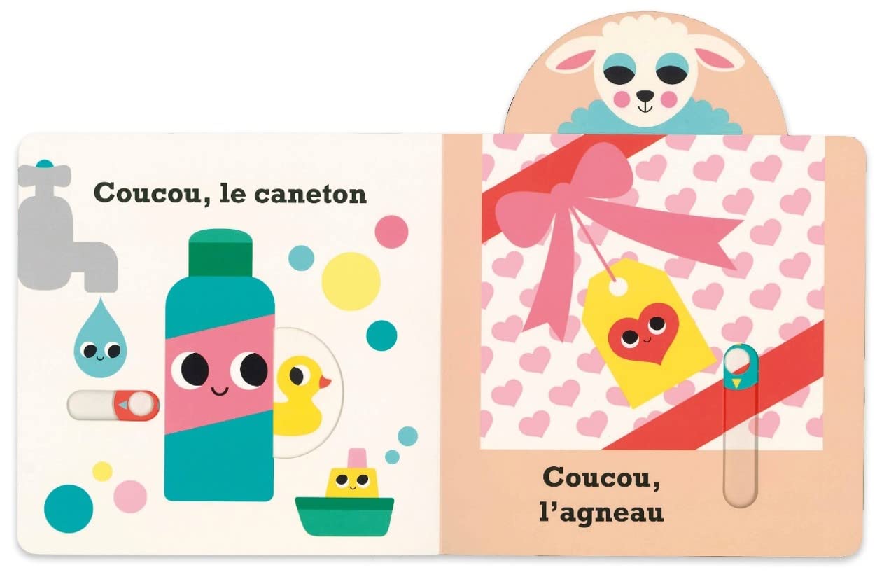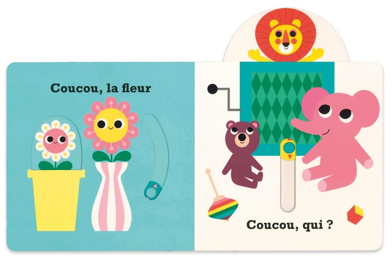 Un tout-carton avec des tirettes, des volets à manipuler et un miroir ! Coucou, le landau ! Et la fleur ! Coucou... toi ! Pousse, tourne, tire et fais glisser les volets et joue à cache-cache ! 7 titres sont déjà disponibles dans cette collection : Coucou Poussin, Coucou Bisous, Coucou Lune, Coucou Ours, Coucou Pomme, Coucou Ferme, Coucou Soleil.