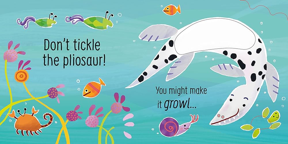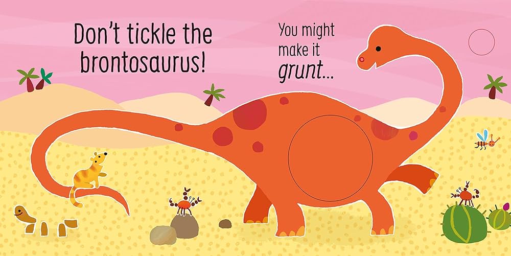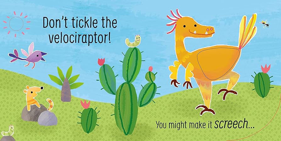 Ce livre de nouveauté irrésistible combine des patchs tactiles avec des sons intégrés pour créer un régal hilarant pour les bébés et les tout-petits. Lorsque vous chatouillerez les zones molles du T.rex et des autres dinosaures, vous les entendrez rugir, grogner et couiner ! À la fin, il y a une finale musicale qui fera danser tout le monde.