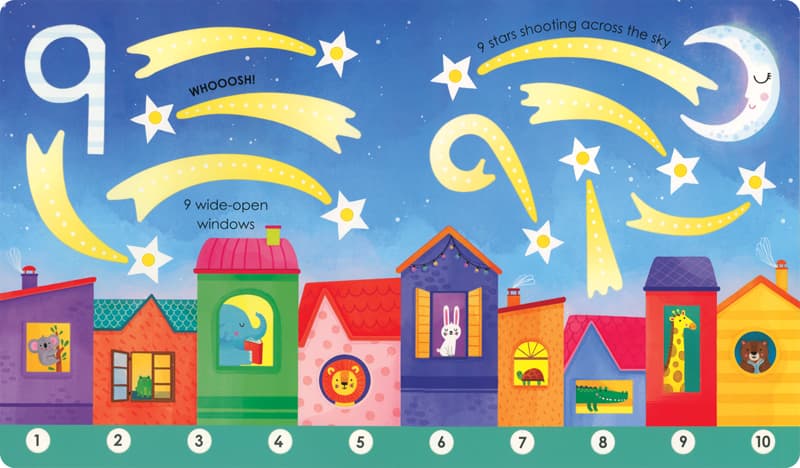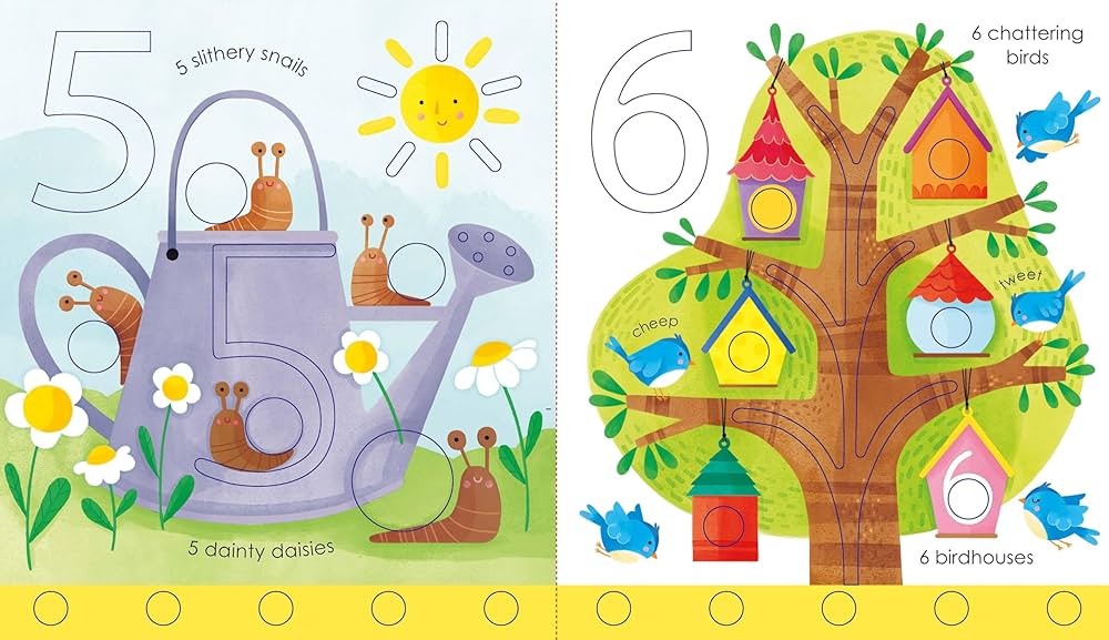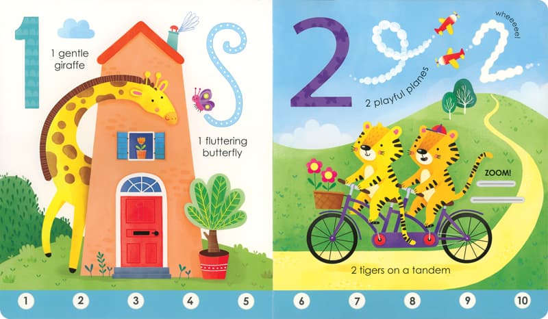 Meet 1 gentle giraffe, 2 tigers on a tandem, 3 trundling tractors and much more in this delightful board book. Gorgeous illustrations, irresistible finger trails and alliterative text combine to help very young children learn number names and shapes, and practice counting