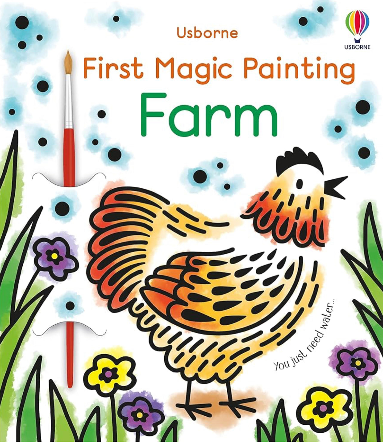 Filled with simple, stylish images designed to appeal to young children. Just brush water over the bold black and white designs to watch a sturdy tractor, a smiling scarecrow and a cheepy chick burst into colour.
