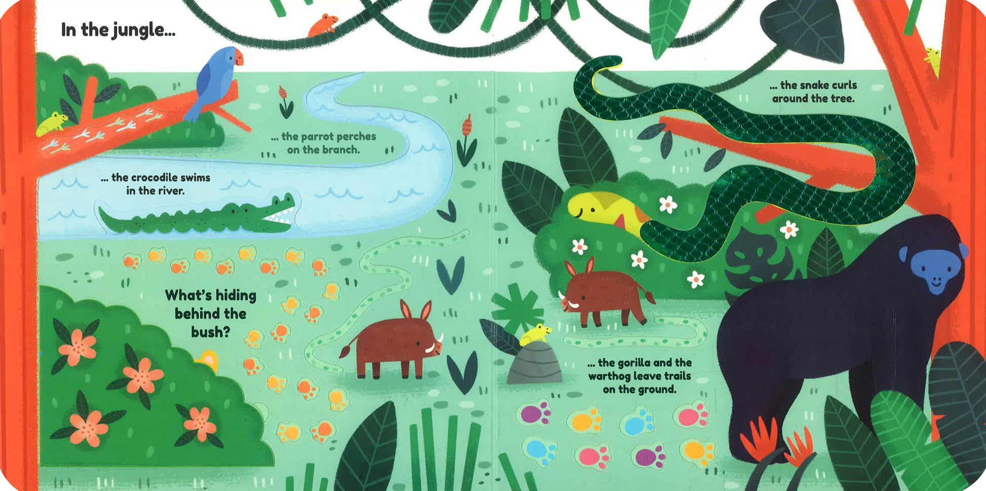 A perfect, interactive first concepts board book all about animals! Follow the trails of slithering snakes, terrific tigers trailing, and giant giraffes. Discover paw prints, furry tails and all kinds of animal tracks and wth exciting touch & feel textures on every page, and flaps to reveal hidden secrets!