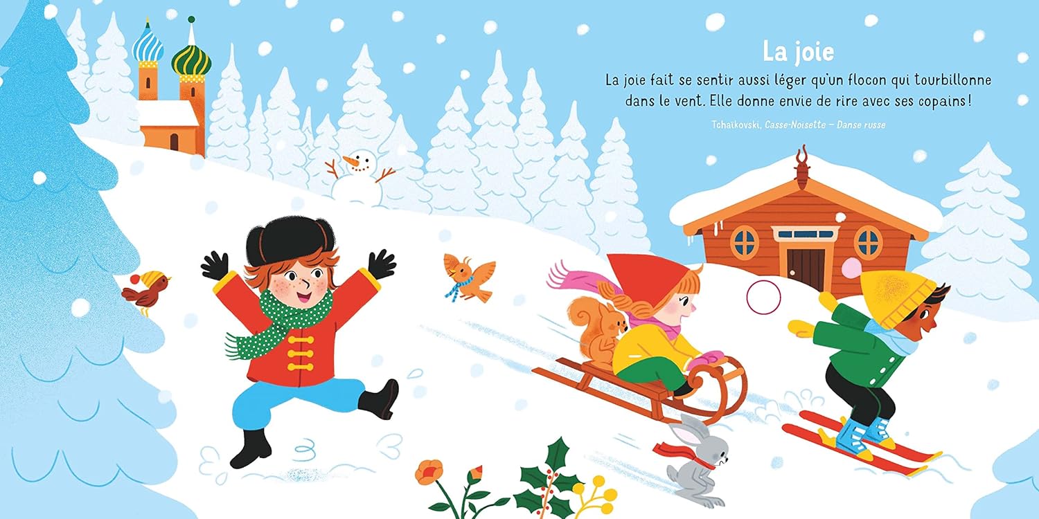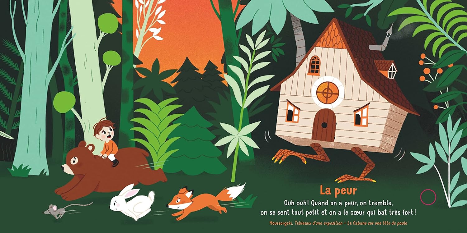 Les musiques de Tchaïkovski, Vivaldi, Fauré, Chopin, Moussorgski pour illustrer les émotions de l'amour, la joie, la peur, la colère et la tristesse. Et pour la première fois, un jeu de cherche et trouve sonore avec une puce sonore aléatoire !L'enfant appuie sur la puce et montre ce qu'il entend. Il appuie à nouveau et cherche à quoi cela correspond, et ce, autant de fois qu'il le souhaite !
