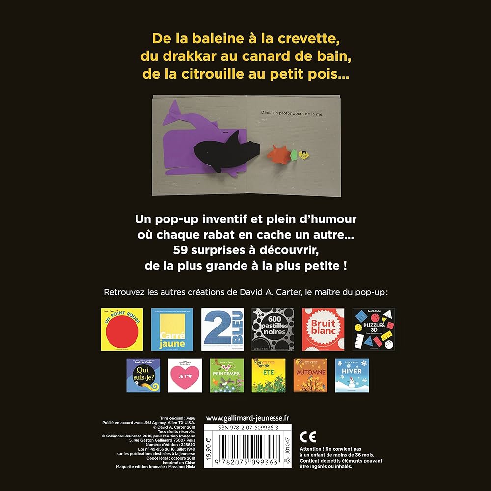 De la baleine à la crevette, du drakkar au canard de bain, de la citrouille au petit pois... Sur chaque page de ce pop-up, des objets sont ingénieusement rangés du plus grand au plus petit : poissons, fruits, bateaux... Chacun des rabats de ce pop-up inventif et plein d'humour révèle alors une surprise, pour le plus grand plaisir de tous les curieux ! Une nouvelle idée originale du génial David A. Carter.