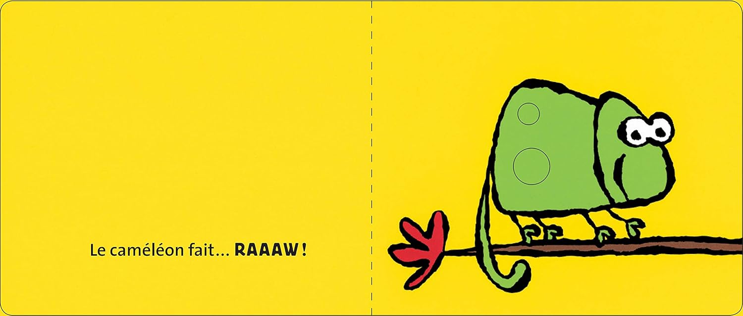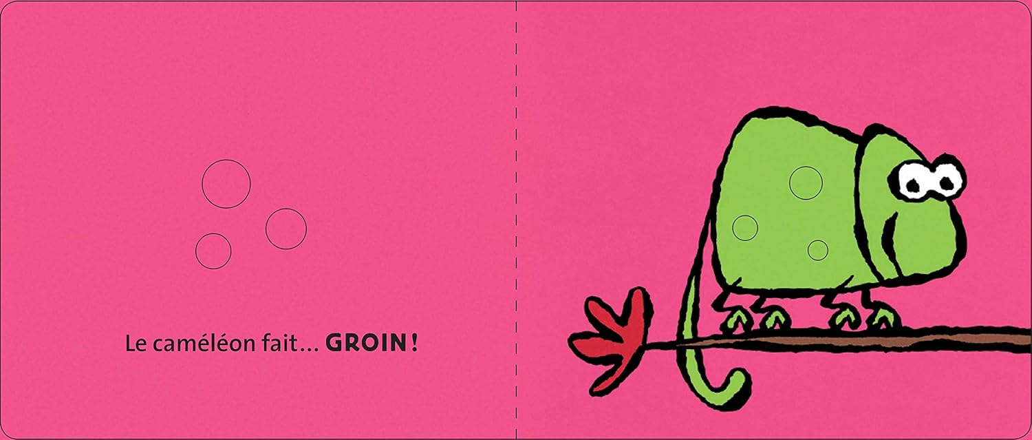 Tout le monde sait que le caméléon est un bon imitateur de couleurs. On sait maintenant qu'il peut faire « Groin, Raaaw, Meuh, Grrr, Aouuuw ou Zzzzz » quand il croise le cochon, le lion, la vache, l'ours, le loup ou la mouche. Mais son cri à lui, qui le connait ?