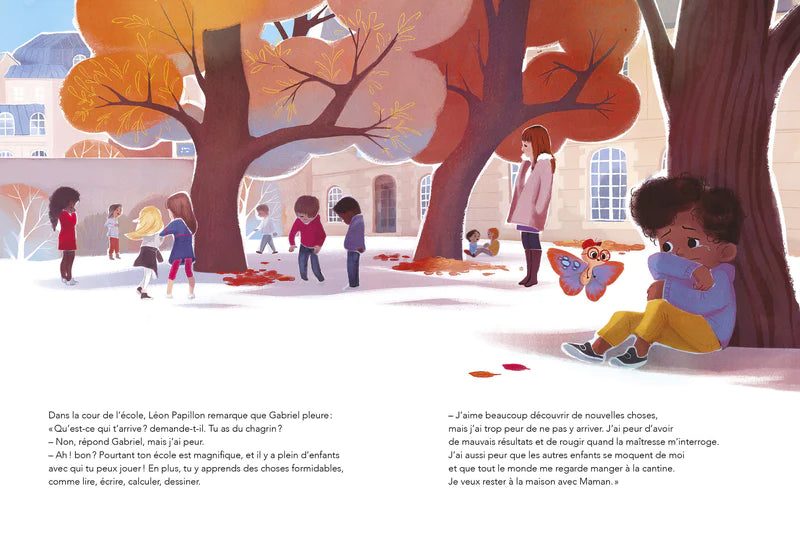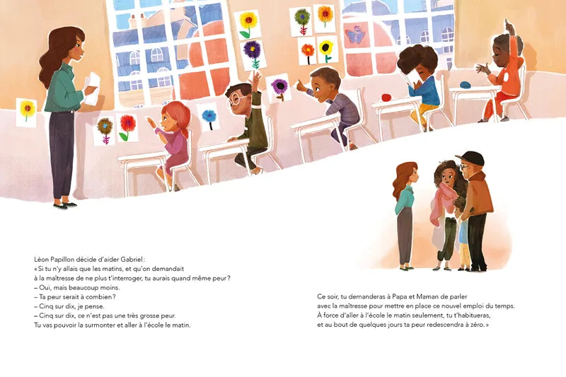 Clément a peur de l’école. Il a peur de ne pas réussir, il a peur que les autres élèves se moquent de lui, il a peur de rougir quand la maîtresse l’interroge. Alors, il ne veut plus aller à l’école. Avec l’aide et les conseils de Léon Papillon, Clément apprend à quantifier sa peur et retourne à l’école progressivement : d’abord le matin, puis à la cantine et finalement toute la journée. Petit à petit, Clément reprend confiance en lui et se fait plein d’amis, il n’a plus du tout peur !