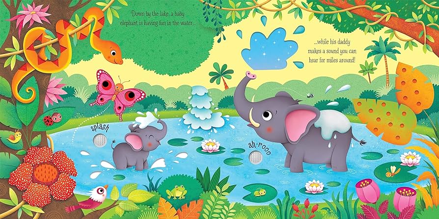 Les petits enfants peuvent appuyer sur les boutons des pages de ce livre pour entendre les sons merveilleux de la jungle, le rugissement d'un tigre affamé, le chant des oiseaux tropicaux et un orang-outan bruyant qui n'est pas encore prêt à se coucher. Les pages colorées montrent la jungle la nuit, le soleil levant et bien plus encore, avec des textes simples, de délicieuses illustrations et des formes découpées à découvrir.