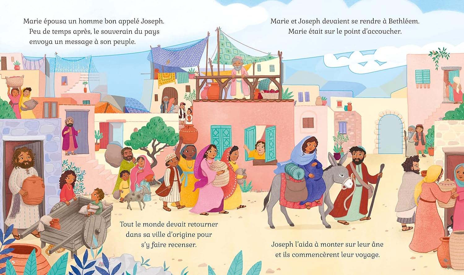 Avec de jolies découpes pleines de surprises, cet album qui recrée l'histoire de la nuit de Noël, de l'Annonciation au voyage de Marie et de Joseph jusqu'à Bethléem et à la naissance de l'enfant Jésus, émerveillera les jeunes enfants. Les étoiles et les trous découpés leur laisseront entrevoir ce qui se cache à la page suivante : des colombes nichées sous le toit de l'étable ou l'intérieur d'une auberge. Un bel album à lire et à relire, pour faire découvrir le récit biblique de la nuit de Noël aux jeunes enfants, avec de nombreuses choses à observer et à commenter sur chaque page.