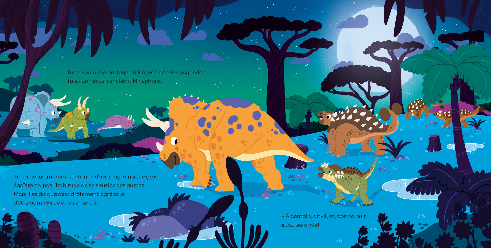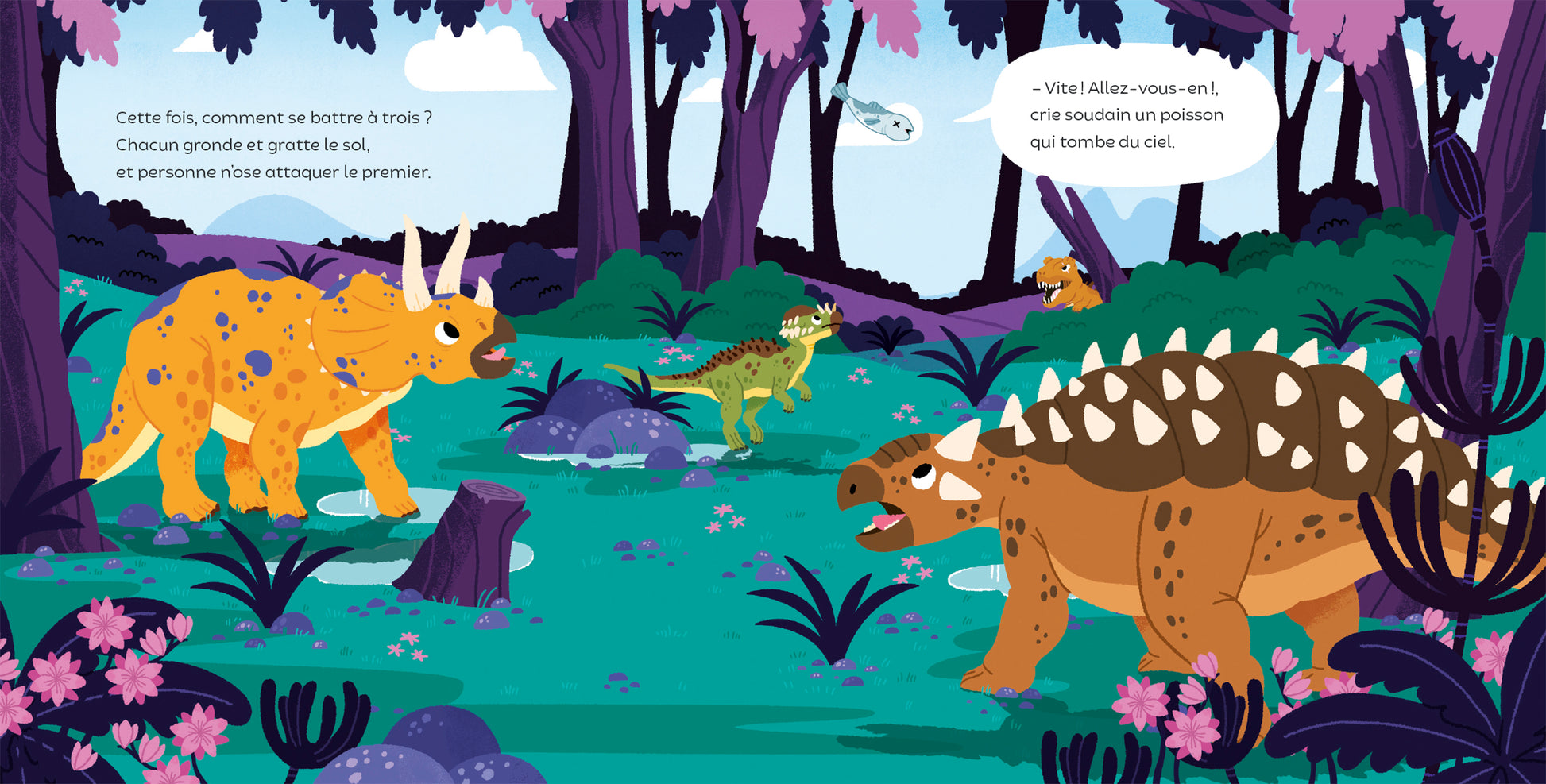 Rollmops le tricératops n’a qu’une idée : brouter toute la journée ses fleurs ! Et il n’a pas l’intention de partager son champ. Alors, quand Casquedor, le pachycéphalosaure, puis Nicéphore, l’ankilosaure viennent paître sur son terrain, c’est la guerre ! Un violent combat démarre ! Jusqu’au moment où, dans un fracas de branches, surgit Bolex, le Trex, qui lui, ne s’attaque pas aux fleurs mais à… Casquedor. Ni une, ni deux, Rollmops se porte au secours du malheureux. Étonné de lui-même, Rollmops, devenu un héros, reconnaît qu’être admiré et avoir des amis avec qui partager, c’est bien mieux que de brouter seul !