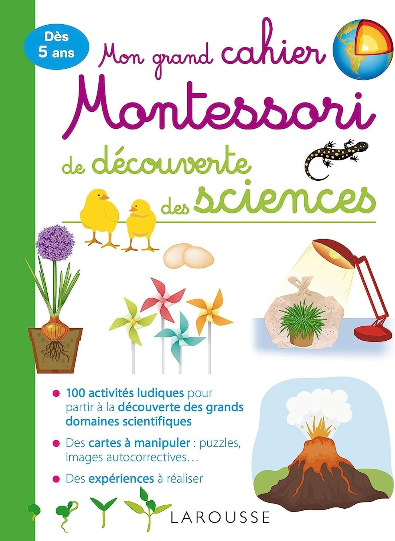 Ce grand cahier propose 100 expériences scientifiques simples et sans danger, et de très nombreuses activités progressives pour faire découvrir aux enfants dès l'âge de 5 ans les grand domaines scientifiques (la chimie, la physique, etc.).
