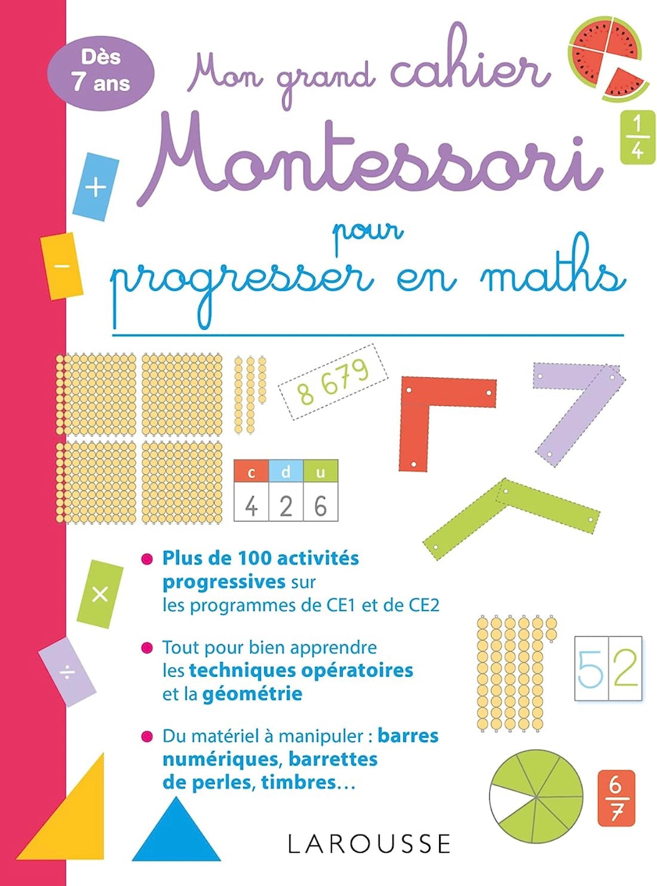 Montessori, ce n'est pas que pour les tout-petits ! Ce cahier s'adresse aux enfants de la fin du CP au CE2 et propose une approche concrète et sensorielle des maths très efficace. Au programme : grandeurs et mesures, multiplications et divisions, avec du matériel à manipuler et à conserver.