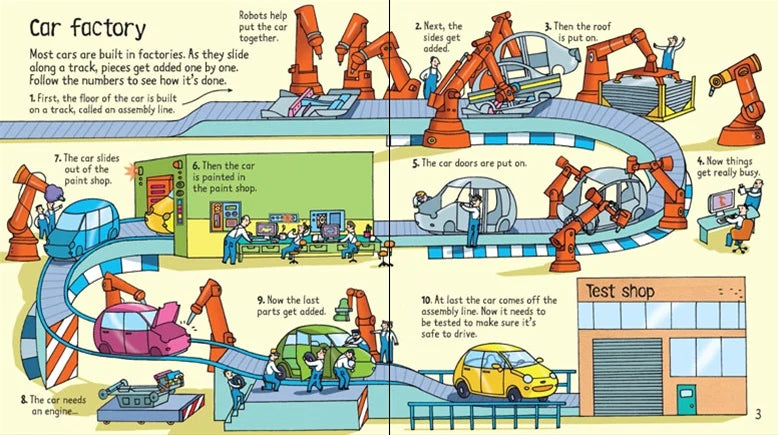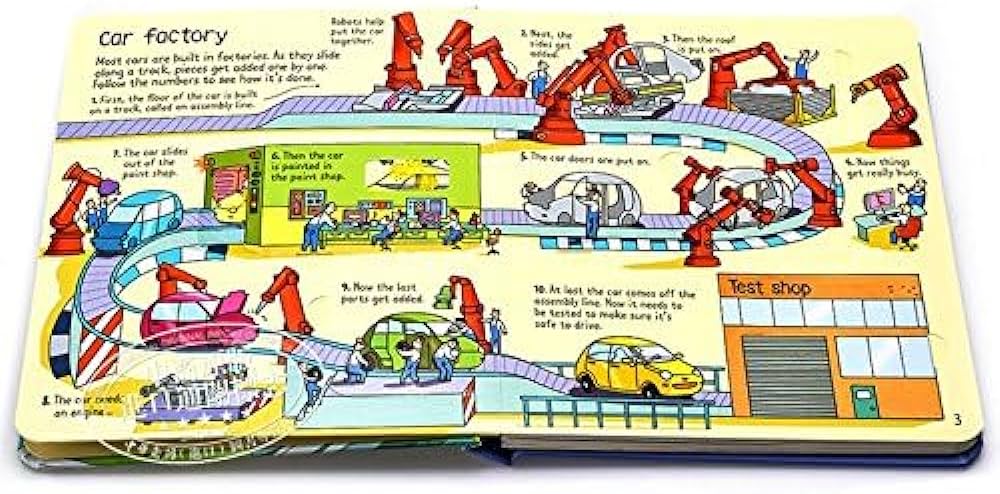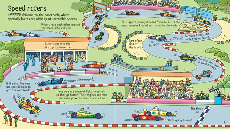 Il s'agit d'un livre à rabat fascinant rempli d'informations intéressantes sur les voitures, de la façon dont les premières automobiles ont été inventées à la vitesse avec laquelle les voitures de course se déplacent sur les pistes. Chacune des sept doubles pages comporte plusieurs rabats à soulever, la plupart avec des doubles rabats, et plusieurs d'entre elles disposent également d'une technologie papier amusante, comme faire glisser une voiture de course ou déplacer une voiture le long d'une chaîne de production dans une usine. D'autres planches se déroulent à l'intérieur d'un atelier de réparation automobile très fréquenté et d'un parc à ferraille où les vieilles voitures sont écrasées.