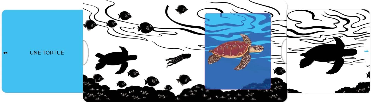 Dans cet imagier, le tout-petit est attiré par la silhouette noire puis découvre l'image en couleur, dont il aime observer chaque détail. Enfin, il entend le nom et se familiarise avec le langage.