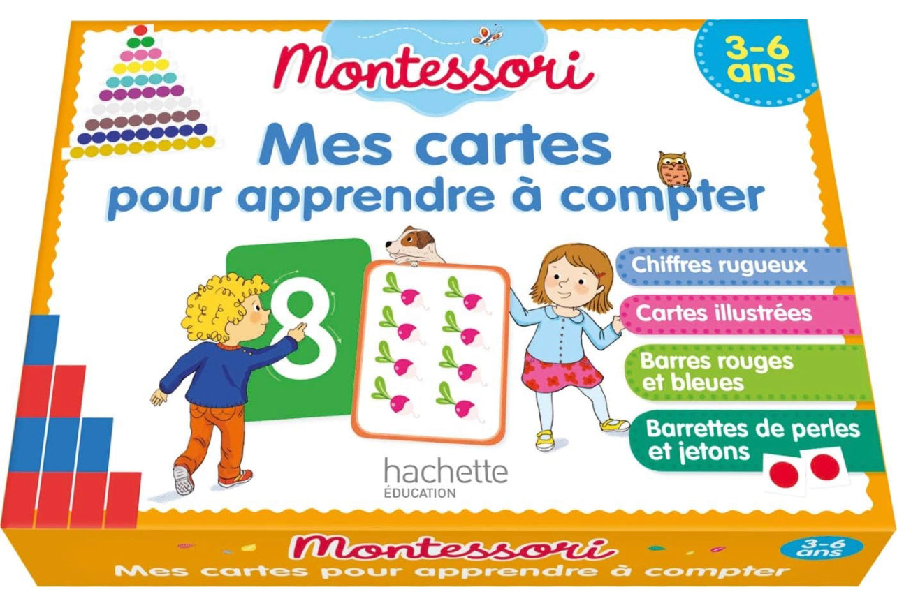 • le matériel sensoriel inspiré par la pédagogie Montessori pour apprendre à compter dès 3 ans grâce à une approche concrète des mathématiques : des chiffres rugueux, des cartes illustrées, les barres rouges et bleues, des barrettes de perles, des jetons et des signes mathématiques.