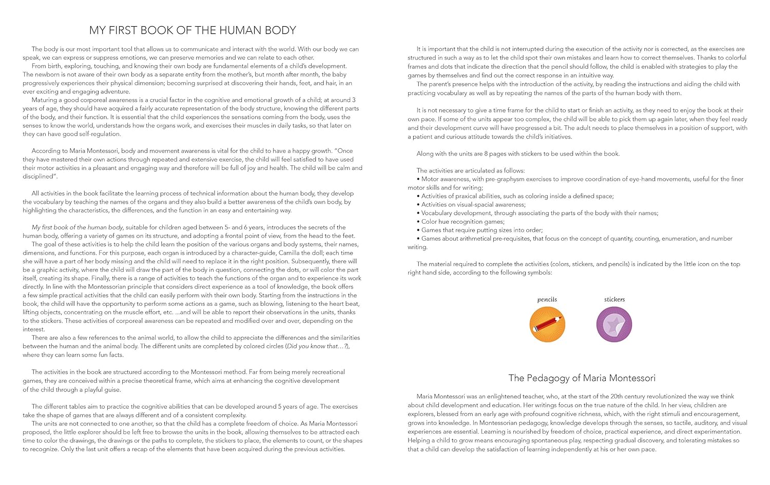 This book accompanies children aged five and up on the discovery of their own bodies with an overview of each body area and the most important internal organs, starting at the top with the head and continuing down to the feet. The cards are inspired by the Montessori Method and help the children to develop an awareness of their own bodies by helping them to learn the name, the position, the size and the function of each organ. Each child interacts with the book but also carries out exercises directly with his or her own body in order to learn to observe it and listen to it. AGES: 5 plus AUTHOR: Chiara Piroddi is a psychologist and expert in Neuropsychology, specialising in Cognitive-Evolutionary Psychotherapy. She graduated in Psychology at the University of Pavia in 2007 and continued as a teaching assistant for the Chair of Physiological Psychology, and as a lecturer in Practical Neuropsychology Training at the same academic institution. She completed her practical training at the Niguarda Ca' Granda Hospital in Milan, where she has worked since 2008, acquiring clinical experience in children with serious mental and physical disabilities of all ages. Agnese Baruzzi graduated in Graphic Design at ISIA (Istituto Superiore per le Industrie Artistiche) in Urbino. She has worked as an illustrator and author since 2001, writing more than 40 children's books that have been published in Italy, the UK, Japan, Portugal, the US, France and South Korea. Includes 8 pages of sticker