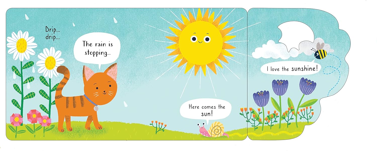 Babies can peer through little peep-holes and unfold really BIG flaps to find an adventurous kitten, wriggly worms and a splashing bird, all enjoying the rain.