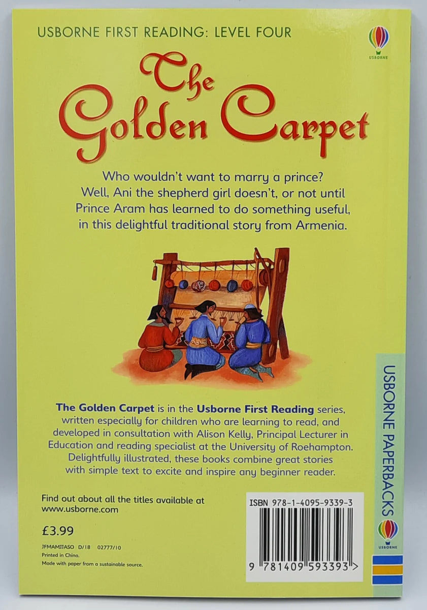 A prince convinces a peasant girl to marry him by learning to weave carpets. The couple rule as king and queen until a wicked magician kidnaps the king, forcing him to be his slave and weave carpets for the magician to sell. In order to escape, the king finds an ingenious way of getting a message to his wife. It is a traditional folktale from Armenia. Part of the Usborne Reading Programme, which includes over 250 titles across seven levels - all developed in conjunction with reading experts at Roehampton University
