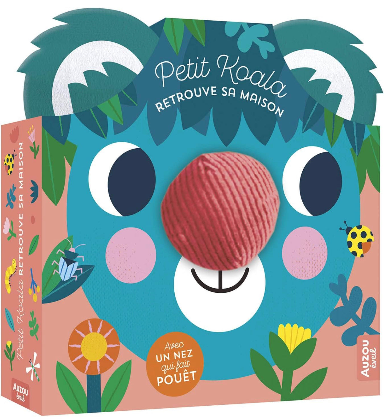 Un livre tissu rond très doux, en forme de tête d’animal, avec gros nez en volume en velours contenant un élément sonore. Un objet multi-sensoriel qui joue - sur l’affect (personnage du petit lion) - sur le rire (pouêt en appui sur le nez) - sur la motricité fine (appui sur le nez) - sur l’éveil tactile (rubans)