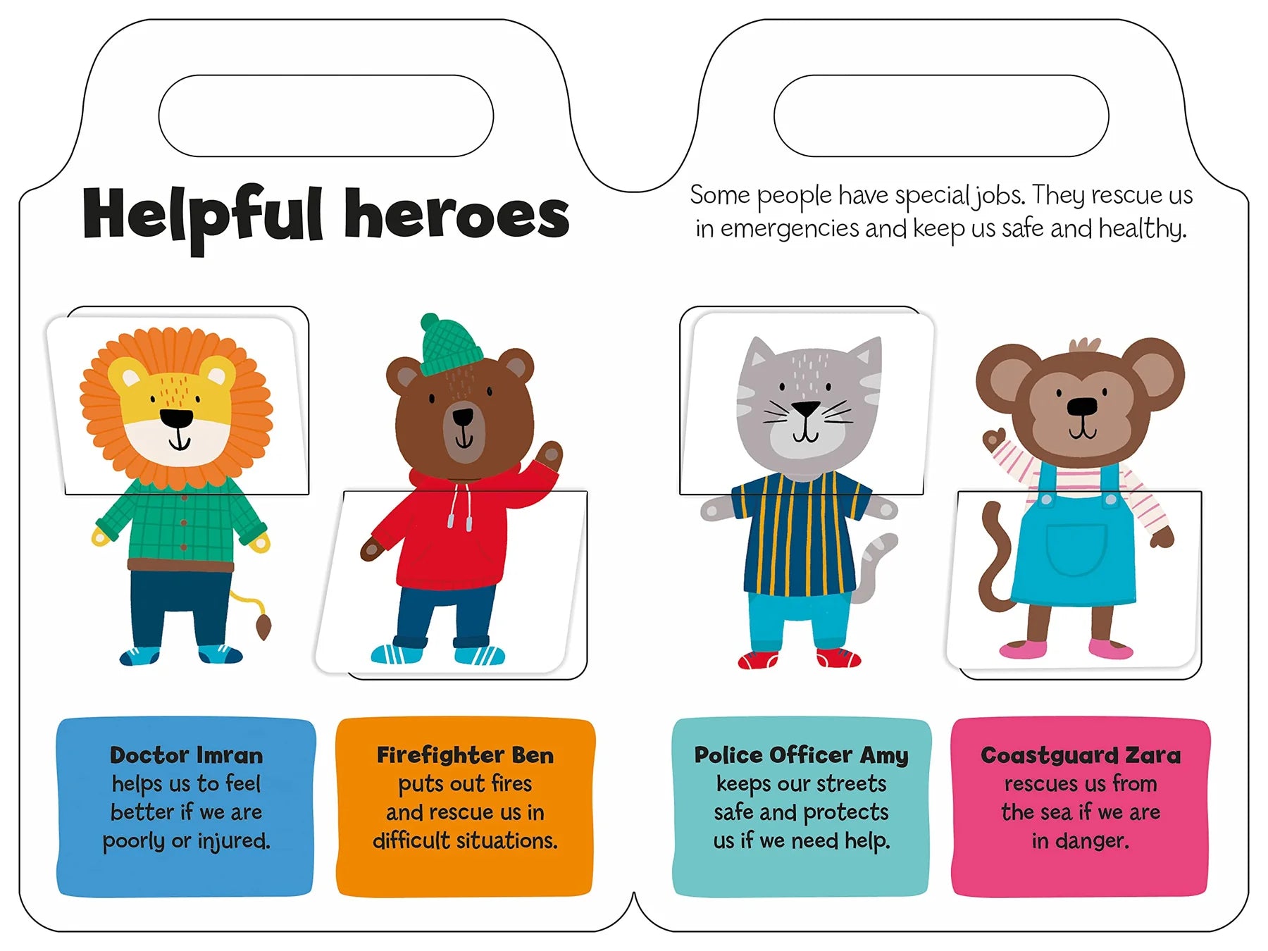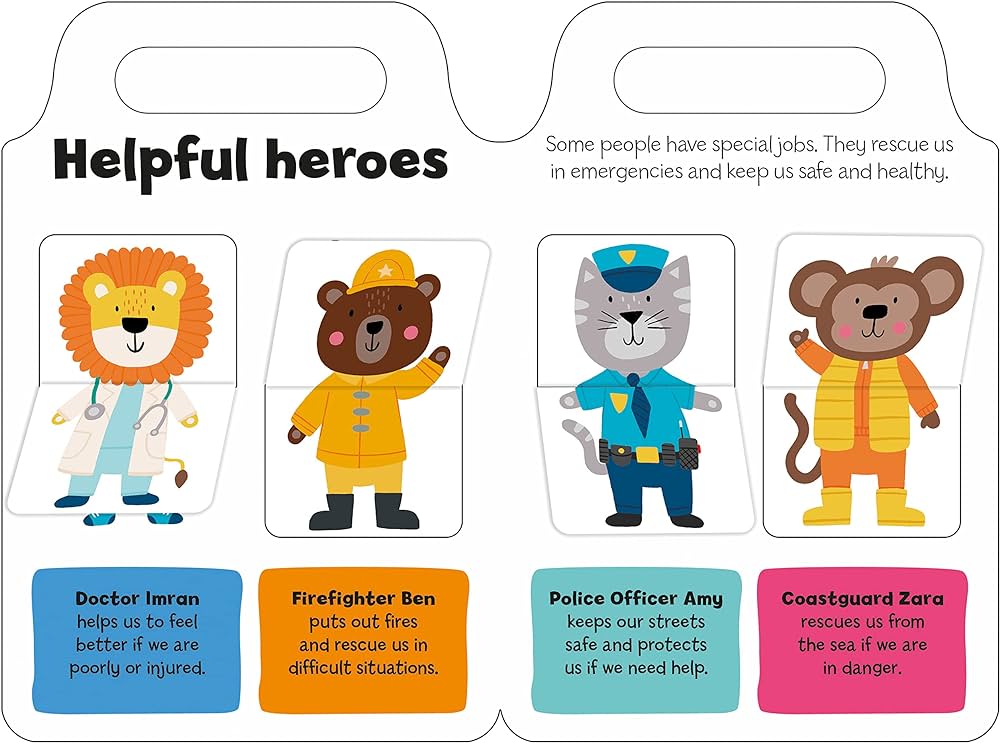 Introduce young children to the heroes that help us in Roger Priddy's Helpful Heroes: Rescue! With a shaped handle and over 20 fun flaps to lift, this carry-along board book is ideal for preschoolers who love to learn on-the-go. Each spread focusses on the people that work in different emergency services, including doctors, firefighters, police officers and coastguards. The friendly animal characters and fun facts are sure to delight young learners.