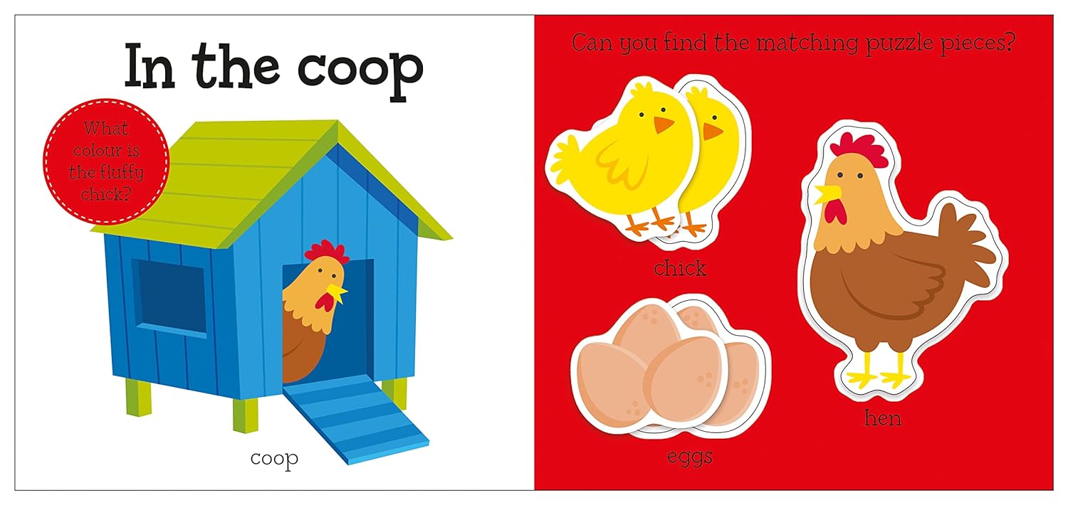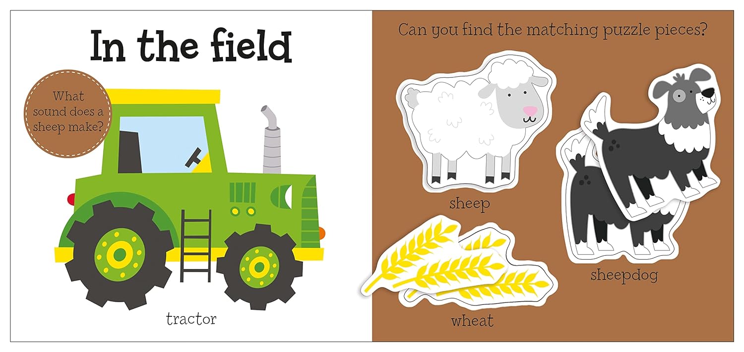 Children can learn about animals, crops, and much more as they go through the book and find different objects. Each of the 12 play pieces matches an image on the page and fits securely into the die-cut spaces, but can also be used separately as flash cards. This book encourages fine motor skills and problem-solving, as well as teaching core vocabulary.