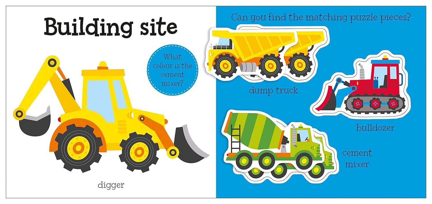 Children can learn about different types of trucks, emergency vehicles, and much more as they go through the book and find different objects. Each of the 12 play pieces matches an image on the page and fits securely into the die-cut spaces, but can also be used separately as flash cards. This book encourages fine motor skills and problem-solving, as well as teaching core vocabulary.