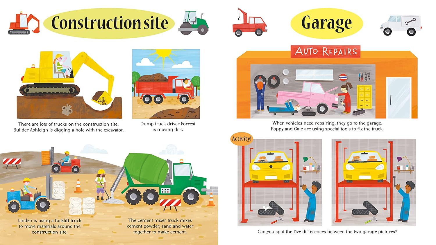 Learn about all kinds of trucks with fact pages, then in the centre of the book discover two pop-up backdrops which create a city scene. There are also press-out trucks to interact with the scenes, creating a unique play space. Once played with, the press-out pieces can be stored in the enclosed envelope so this book can be easily transported and enjoyed again and again.