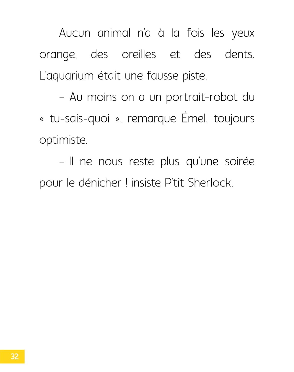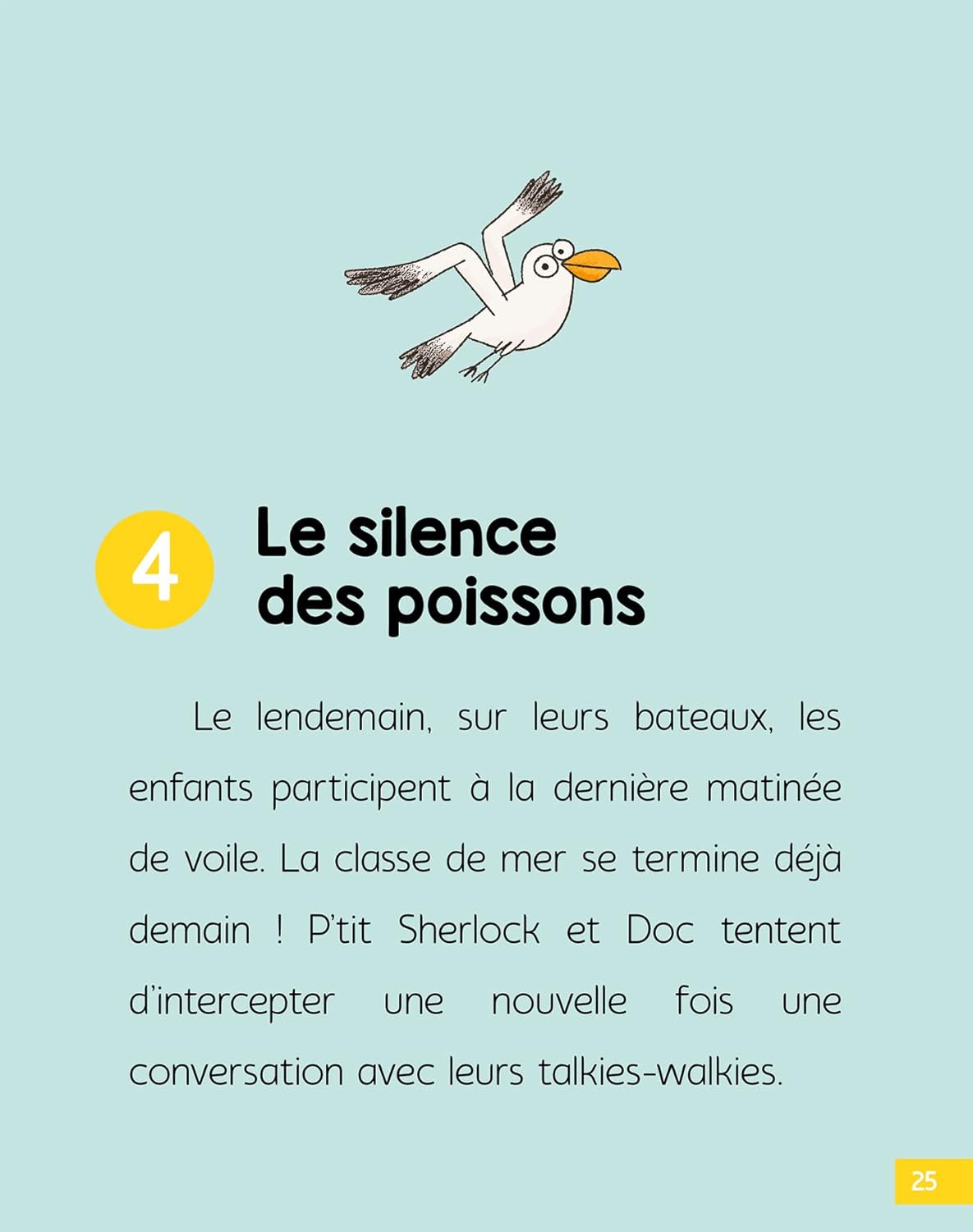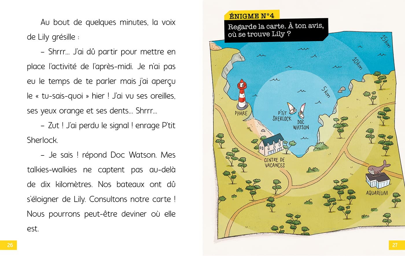 Des histoires faciles à lire, adaptées aux jeunes lecteurs. De nombreuses illustrations à observer attentivement pour résoudre les énigmes. Les solutions des énigmes au fil de l'histoire, pour ne pas bloquer la lecture. Différentes typologies d'énigmes :- Jeux d'observation- Jeux de lettres : rébus, mots en désordre...- Jeux d'identification type « Qui est-ce ? » Toute la petite bande se retrouve en classe de mer, pour apprendre à faire de la voile. Grâce à leurs talkies-walkies, P'tit Sherlock et son copain Doc Watson interceptent un message en pleine mer. Une terrible créature a été aperçue...