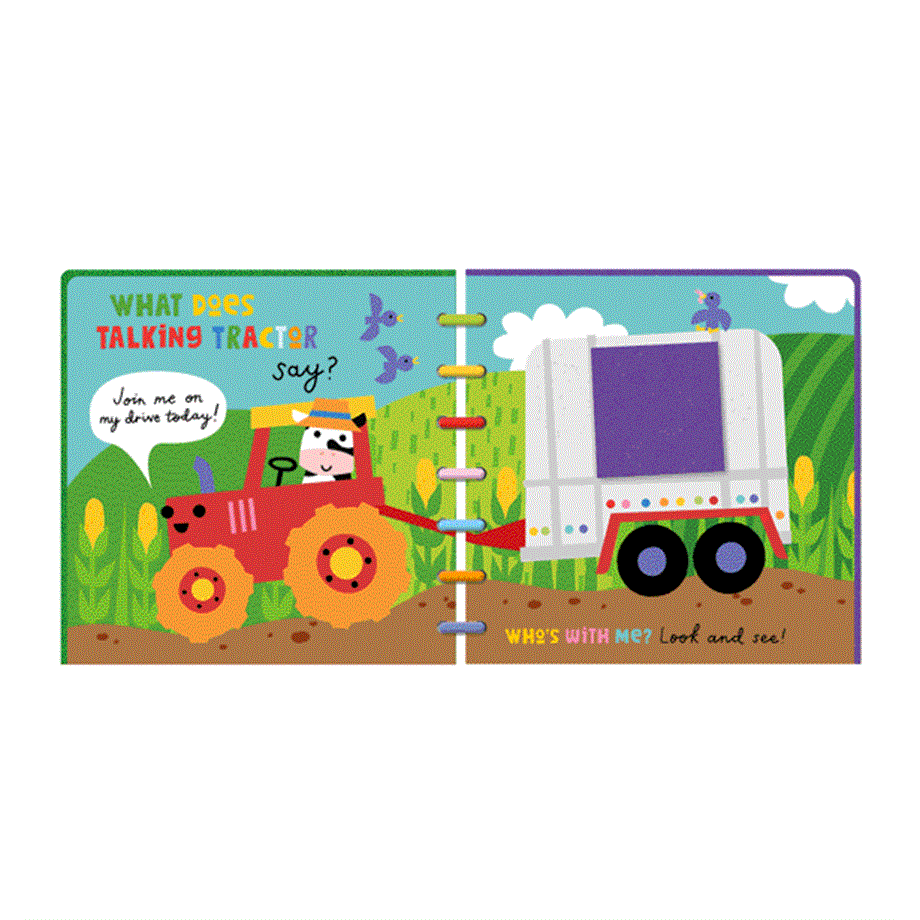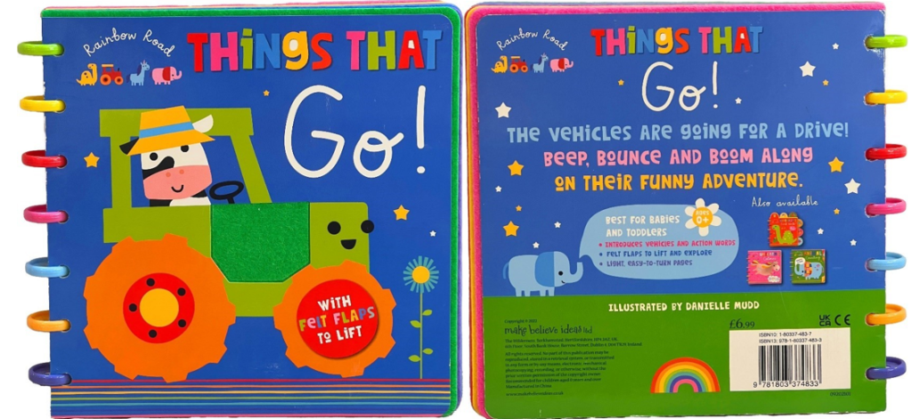 This sweet book teaches children first vehicle words! The book uses fun, simple language and bright illustrations to engage little ones. Rainbow-coloured plastic loops hold the pages together, creating a tactile and durable spine that is great for young children to explore with their hands. Plastic loops on spine. Teaches children first vehicle words. Bright illustrations and simple text.