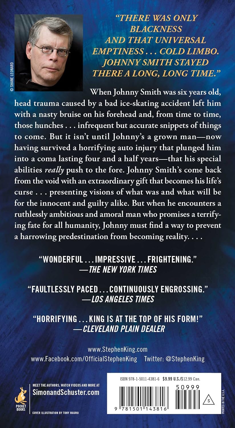 When Johnny Smith was six-years-old, head trauma caused by a bad ice-skating accident left him with a nasty bruise on his forehead and, from time to time, those hunches…infrequent but accurate snippets of things to come. But it isn’t until Johnny’s a grown man—now having survived a horrifying auto injury that plunged him into a coma lasting four-and-a-half years—that his special abilities really push to the fore. Johnny Smith comes back from the void with an extraordinary gift that becomes his life’s curse…presenting visions of what was and what will be for the innocent and guilty alike. But when he encounters a ruthlessly ambitious and amoral man who promises a terrifying fate for all humanity, Johnny must find a way to prevent a harrowing predestination from becoming reality.
