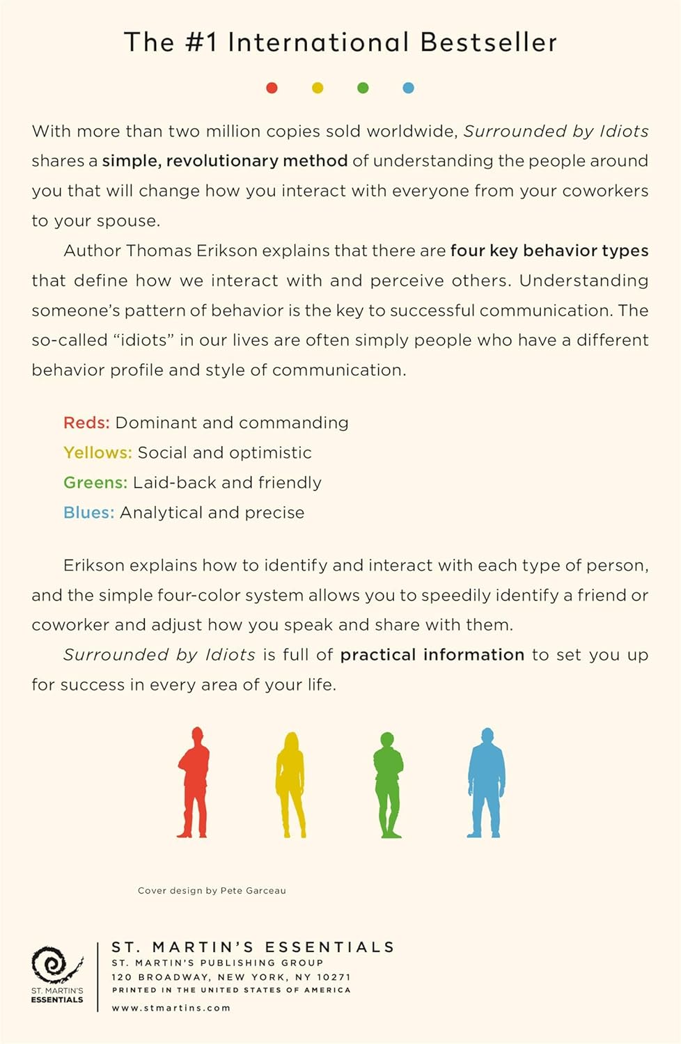 Surrounded by Idiots is an international phenomenon, selling over 1.5 million copies worldwide. It offers a simple, yet ground-breaking method for assessing the personalities of people we communicate with – in and out of the office – based on four personality types (Red, Blue, Green and Yellow), and provides insights into how we can adjust the way we speak and share information.