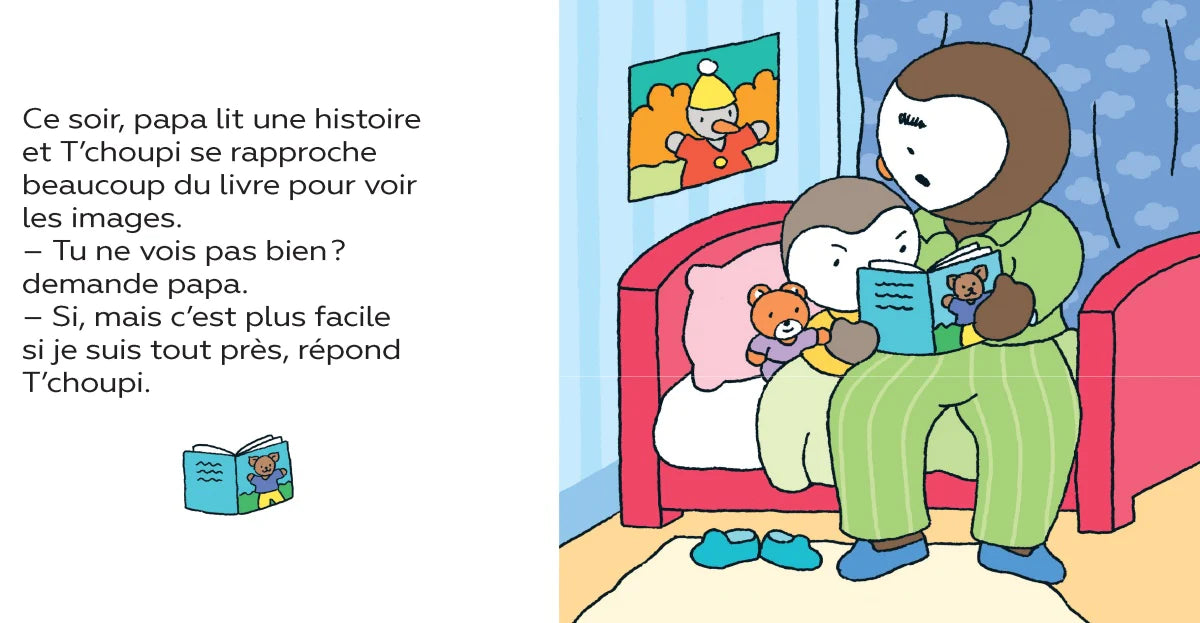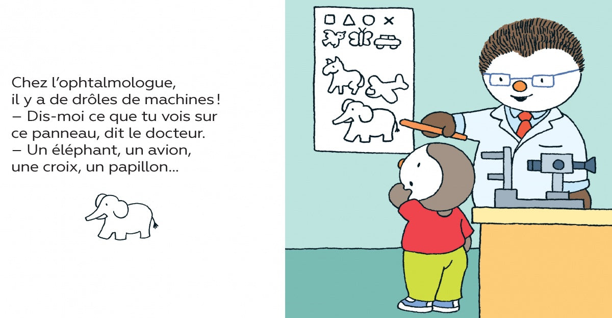 Résumé de l'histoire : Papa remarque que T'choupi se rapproche beaucoup de son livre pour voir les images. Alors, il l'emmène chez l'ophtalmologue, qui annonce à T'choupi qu'il devra porter des lunettes en classe. T'choupi et papa vont ensuite chez l'opticien choisir de belles lunettes bleues. Mais le lendemain, quand il doit les porter en classe, T'choupi est un peu intimidé... Pourtant, il va vite les adorer, et ne plus vouloir les quitter!
