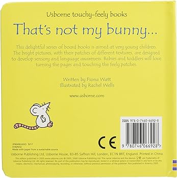 A delightful touchy-feely book with simple, repetitive text. Bright, colourful illustrations with textures to touch and feel on every page. Helps very young children develop language and sensory skills.