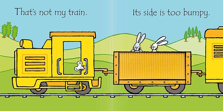 A mouse searches for his train among ones that are not his because their windows are too shiny or their sides are too bumpy.