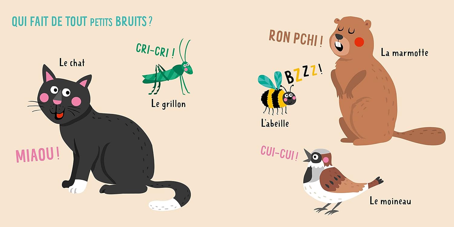Qui vole là-haut et qui nage sous l’eau ? Qui crie et qui fait de tout petits bruits ? Un premier imagier pour reconnaître les animaux, découvrir leurs habitats, imiter leurs cris et enrichir son vocabulaire et ses connaissances.